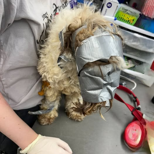 When one of the staff members opened the dumpster to investigate, what they saw was far worse than they imagined. Instead of a raccoon, they found a small dog — alive but wrapped extensively in duct tape.