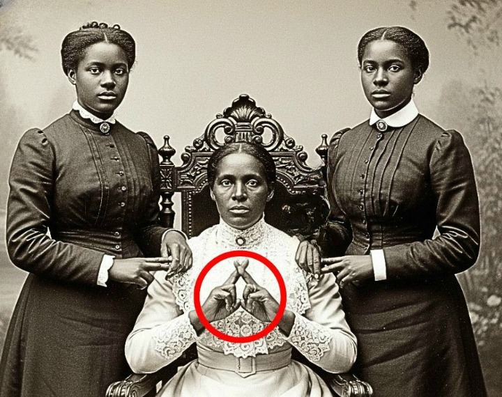 It was just a portrait of a mother and her daughters, but look more closely at their hands: Dr. James Mitchell had spent 15 years studying photographic archives at the New York Historical Society, yet he had never seen anything quite like this portrait, which arrived in a donation box from an estate sale in Brooklyn containing dozens of glass plate negatives wrapped in yellowed newspaper from 1923, most showing typical late 19th-century scenes of stern merchants, wedding parties, and children in Sunday clothes, until one image stopped him cold—three African-American women stared back through time, a mother of about forty seated in an ornate wooden chair with her two daughters, likely in their late teens or early twenties, standing on either side, all dressed in their finest high-collared dresses with intricate lacework, hair styled with care against a painted studio garden backdrop common for the era, and what unsettled James was not their dignified expressions but their hands: the mother’s hands rested in her lap with fingers interlaced in an unusual, deliberate pattern, her right thumb crossed over her left with index and middle fingers extended while the others curled inward,