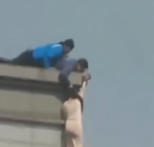 In the video, the girl can be seen dangling helplessly from a balcony, her body pressed against the outer wall, desperately holding on with fading strength. Onlookers screamed in horror, but before tragedy could strike, two brave men sprang into action.