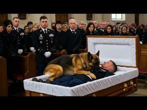Someone gently opened Rex’s crate, and the German Shepherd stepped out. He sniffed the air cautiously, clearly aware that something was different. Slowly, he walked toward the casket, pausing only for a moment—then, in an unexpected and poignant act, Rex leapt onto the casket, laying his body across the top, head nestled gently beside the folded flag.