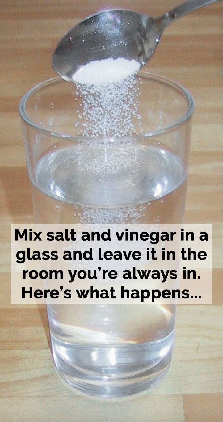You’ll need a glass, some water, white vinegar, and salt. Fill a glass halfway with water, then add two tablespoons of vinegar and one tablespoon of salt. Stir until the salt dissolves completely. Once mixed, place the glass in any room where you want fresher air